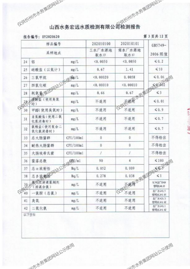 忻州城區公共供水水源水、出廠水、管網水、管網末梢水2020年10月份水質信息公示