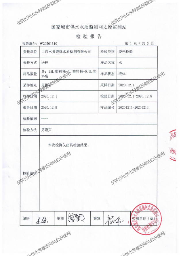 2020年忻州城區公共供水南水廠、三水廠、云中水廠出廠水106項水質全分析