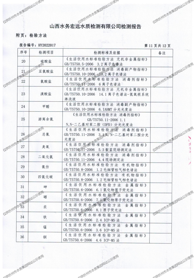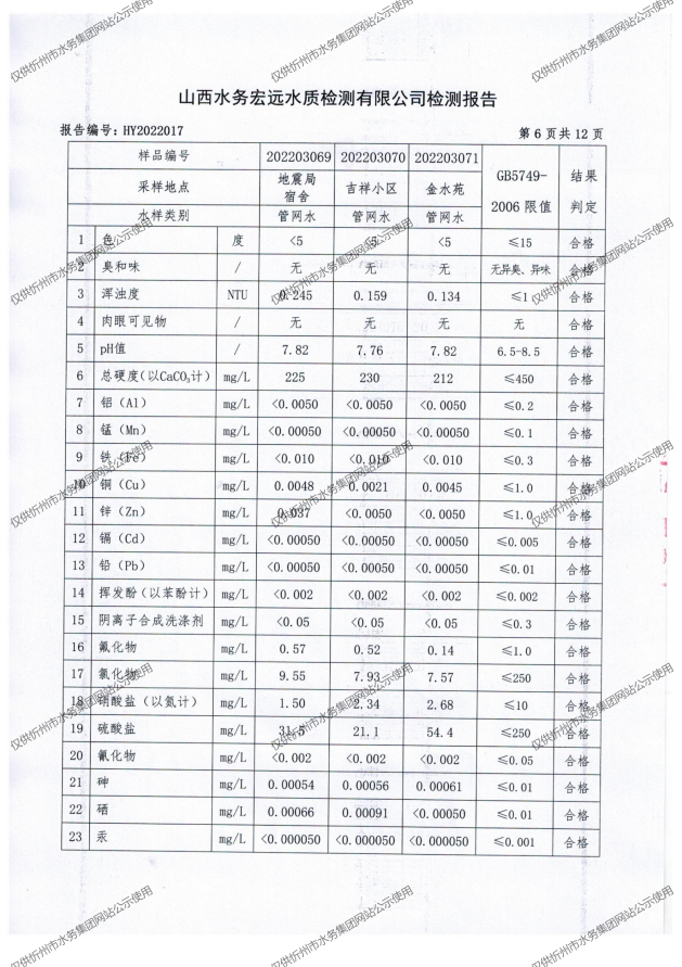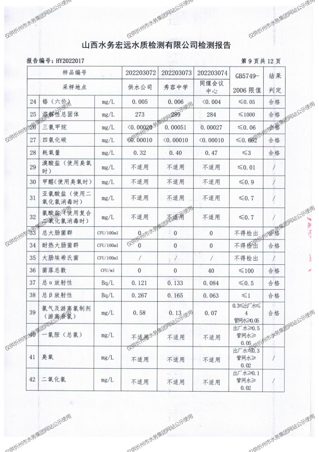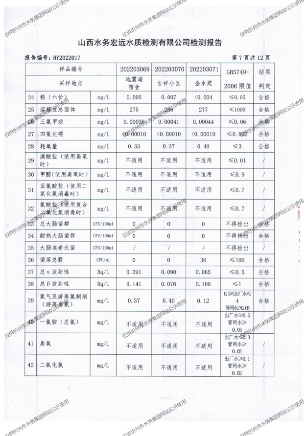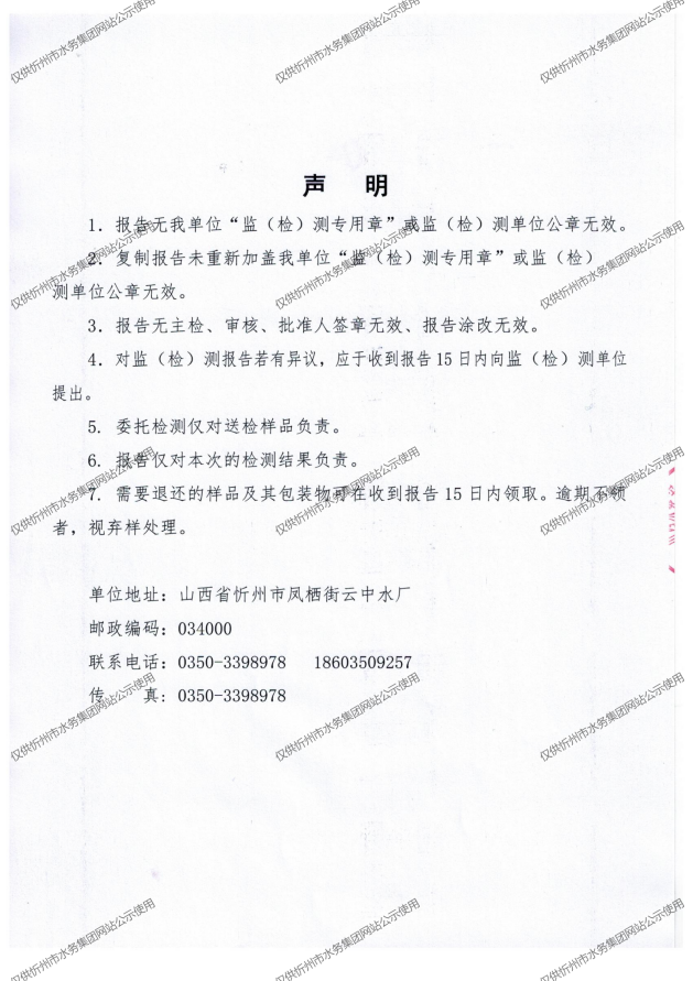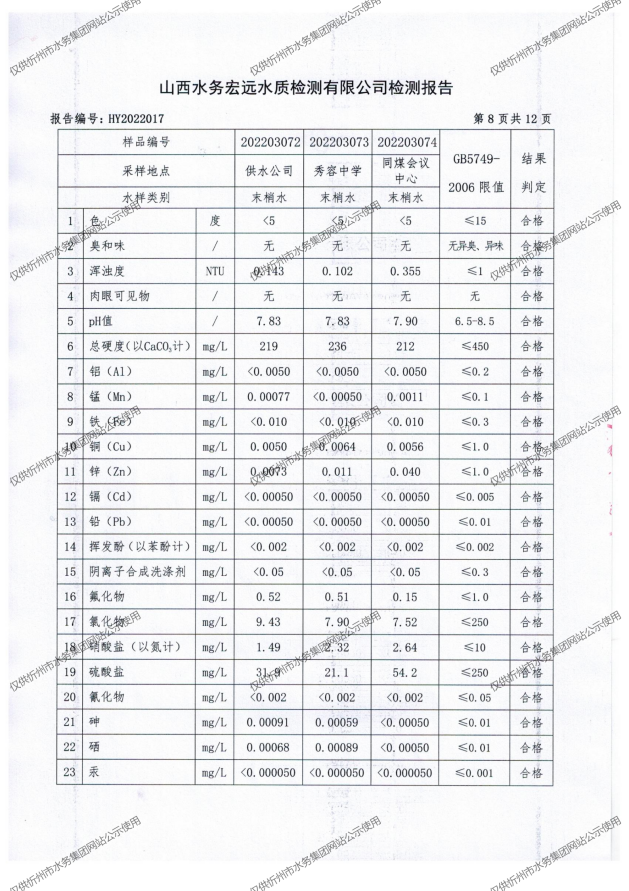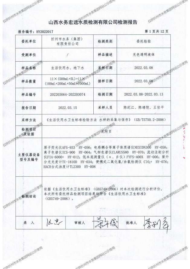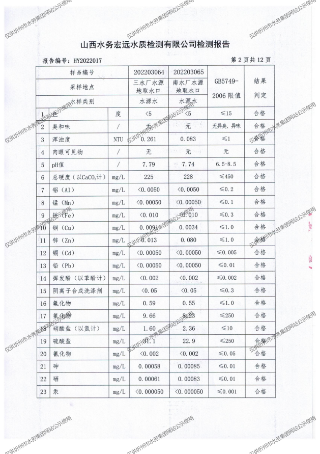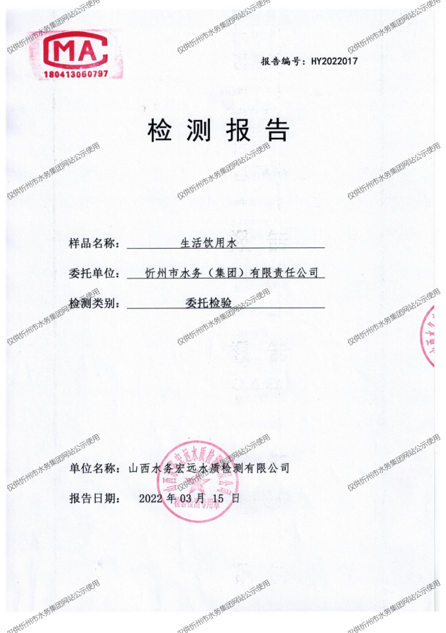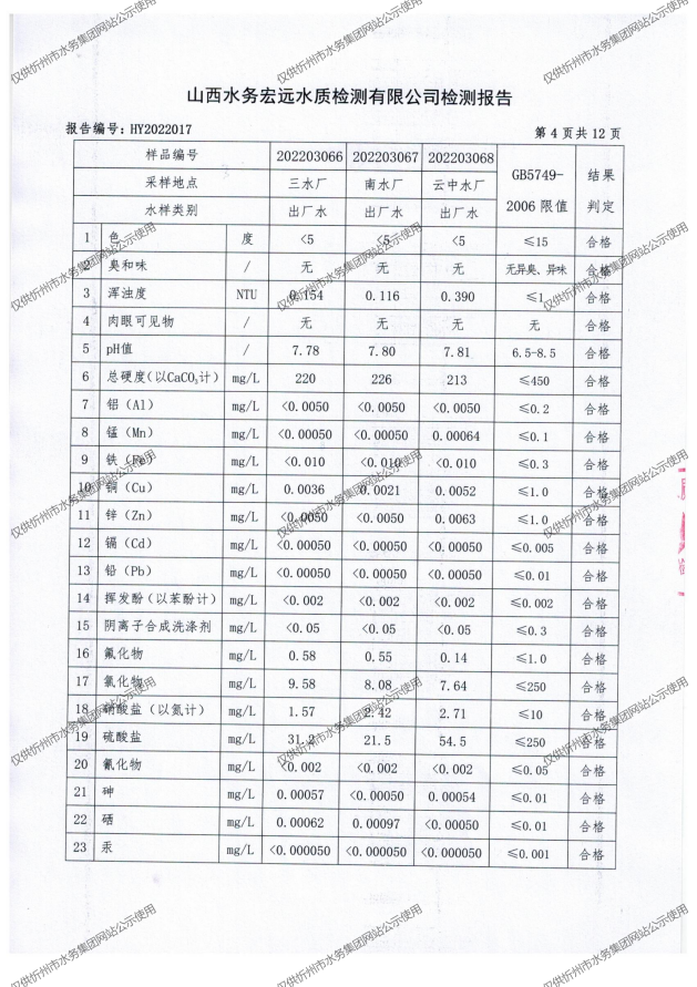 忻州城區公共供水水源水、出廠水、管網水、管網末梢水2022年3月份水質信息公示