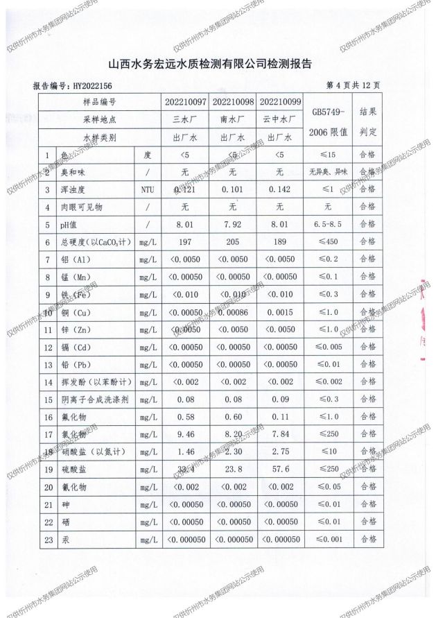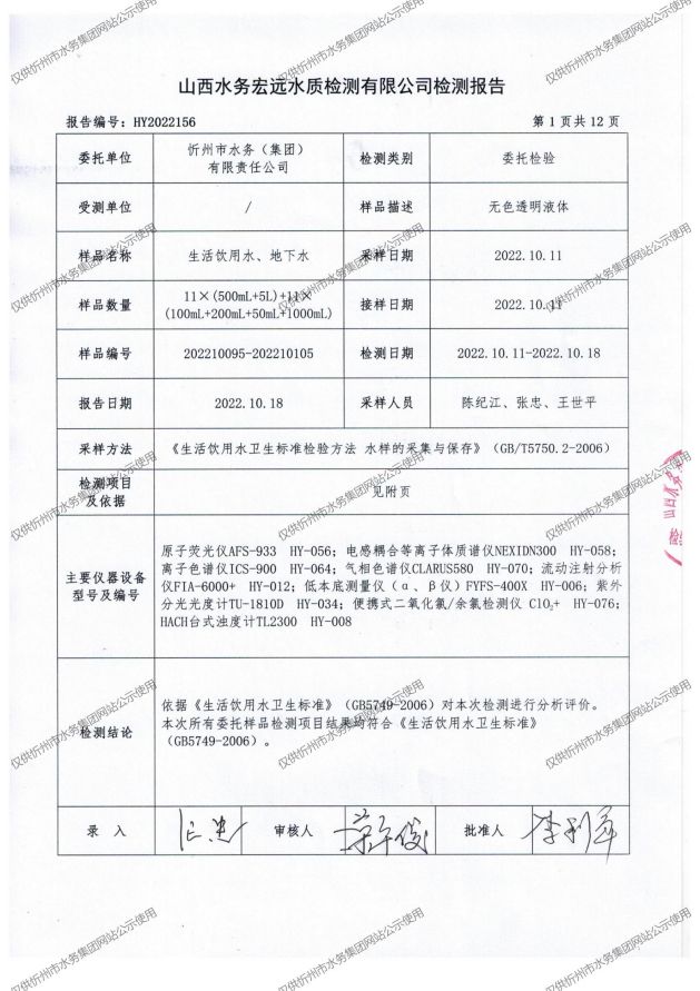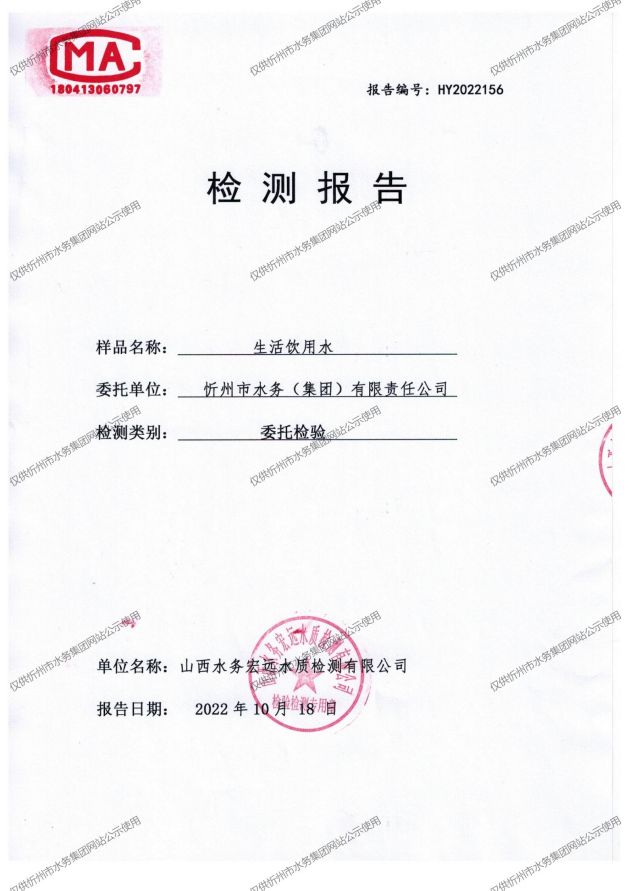 忻州城區公共供水水源水、出廠水、管網水、管網末梢水2022年10月份水質信息公示