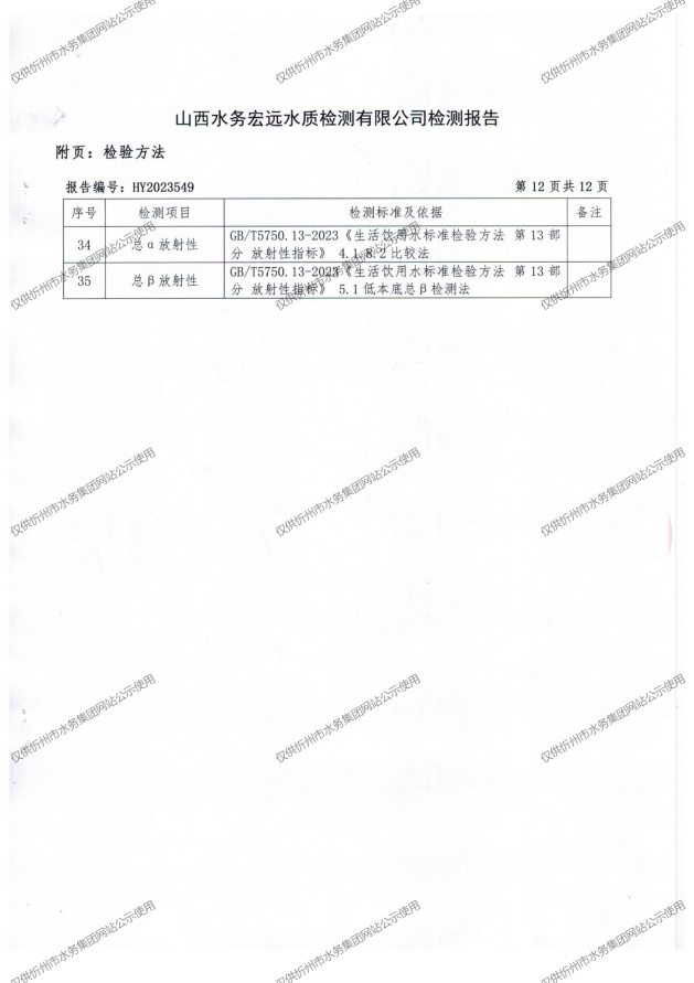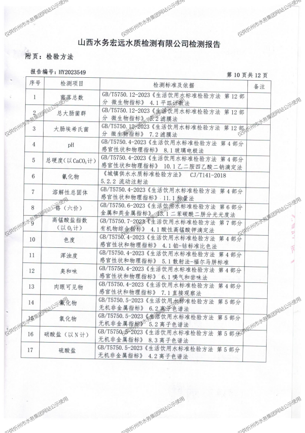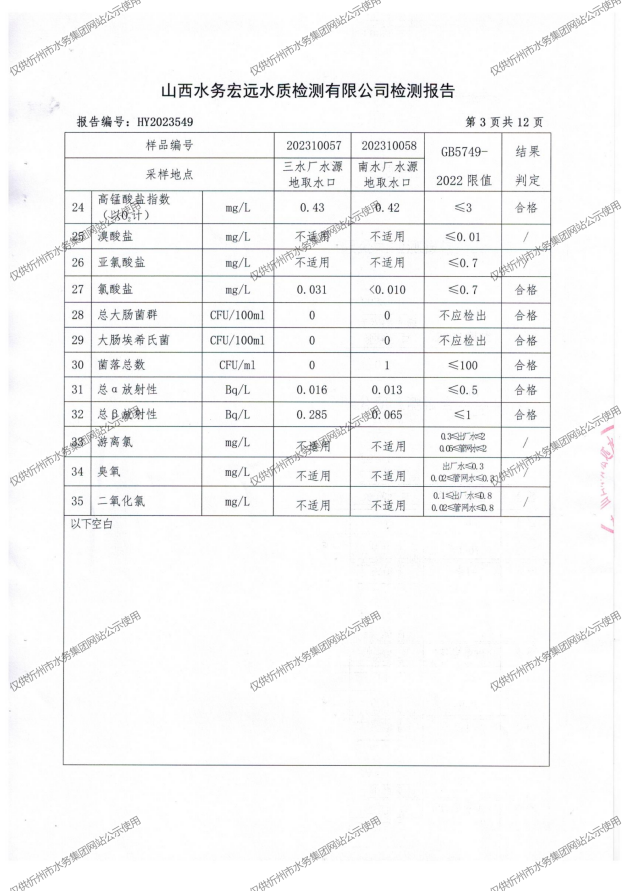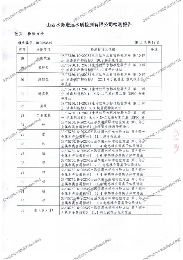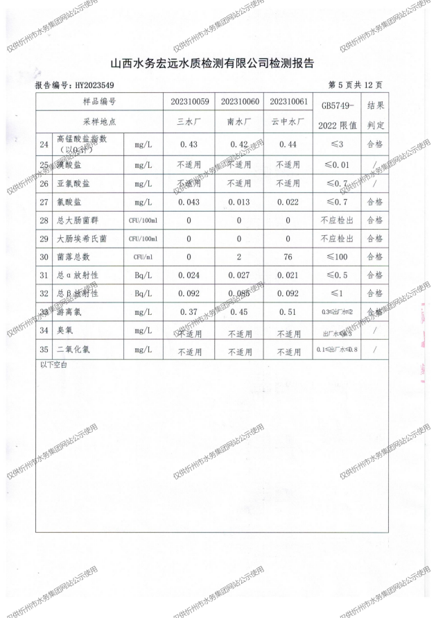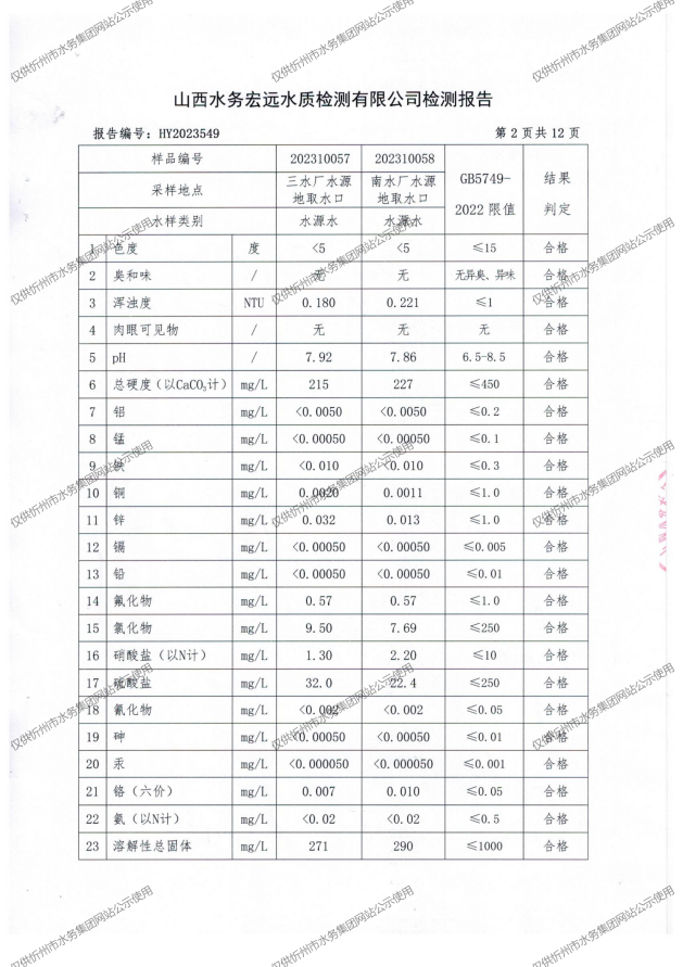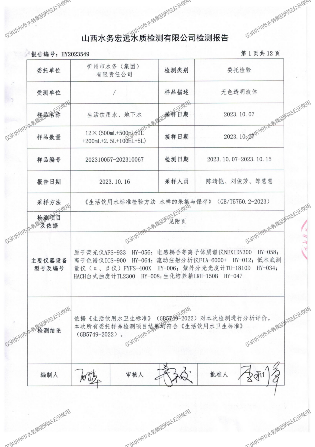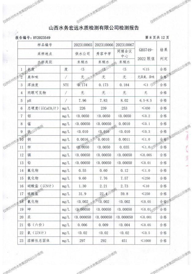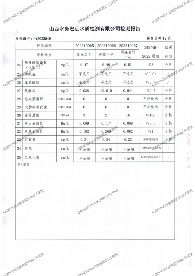 忻州城區公共供水水源水、出廠水、管網水、管網末梢水2023年10月份水質信息公示