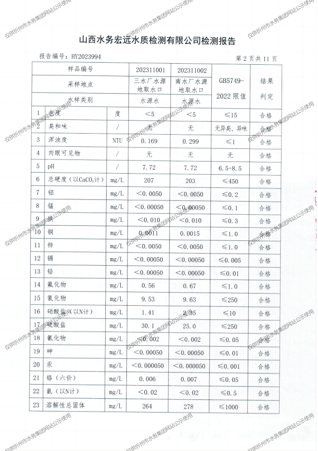 忻州城區公共供水水源水、出廠水、管網水、管網末梢水2023年11月份水質信息公示