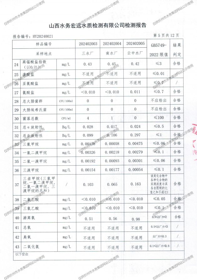 忻州城區(qū)公共供水水源水、出廠水、管網(wǎng)水、管網(wǎng)末梢水2024年2月份水質信息公示