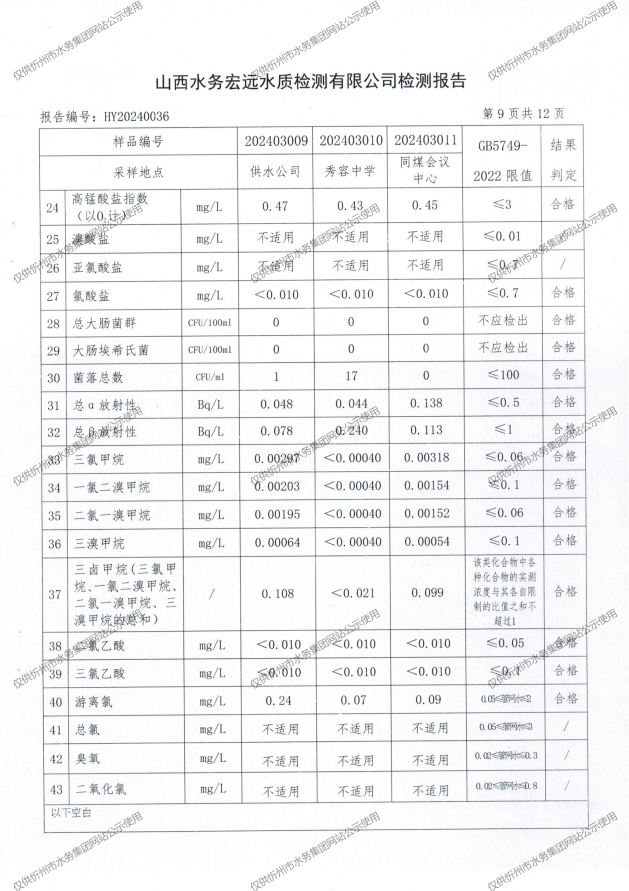 忻州城區公共供水水源水、出廠水、管網水、管網末梢水2024年3月份水質信息公示